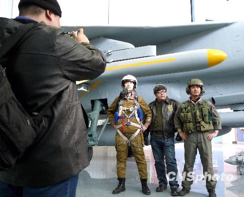 航空迷穿着自带的航空服在战机前拍照留影。中新社发 玉龙 摄