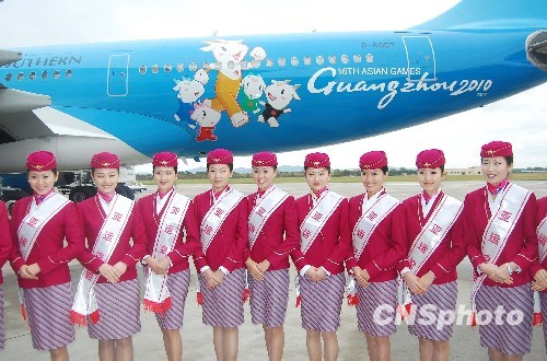 十一月十六日下午,第十六届广州亚运会运送圣火专机“亚运号”在广州南航总部基地机库亮相首航。飞机上彩绘着广州亚运会吉祥物“祥和如意乐羊羊”,这也是南航第一架彩绘飞机。