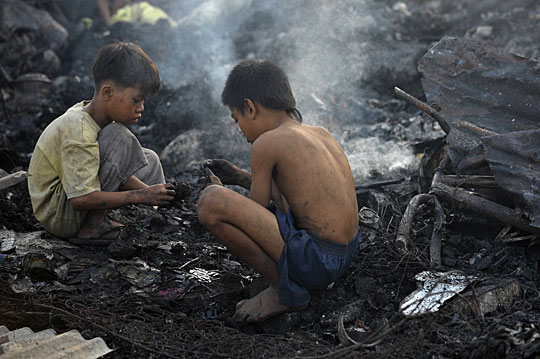 图为被大火烧毁房屋的居民回到现场,找寻可以使用的东西。