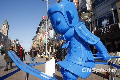 11月17日,在北京王府井大街,一尊将秦佣、公仔、运动、时尚融为一体的“中国特色”雕塑作品“小秦”,吸引了过往游人。中新社发 郑雄增 摄