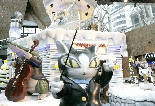 图为可爱的猫咪天使大型圣诞装置吸引了市民的目光。中新社发 张勤 摄