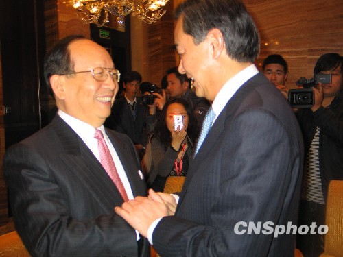 图为王毅与蒋孝严(左)亲切握手。中新社发 冽玮 摄