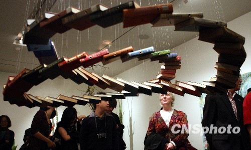 当地时间11月18日,即将在纽约美国华人博物馆开展的《此时此地:纽约的华人艺术家》展览的一角。该展览主即将于11月19日开展,参展四位艺术家以各种艺术手法展现中西文化间界限的跨越和交融。图为展厅中央三十本中文书和三十本外文书分别构成两个彼此相扣的圆环,吊在空中,如同纽约常见的中西交错的文化融合。中新社发 孙宇挺 摄