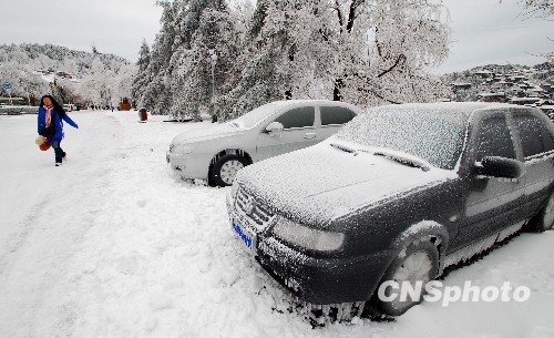 11月18日,在江西庐山北山景区,一名行人从两辆裹着冰层的汽车旁走过。中新社发 胡国林 摄