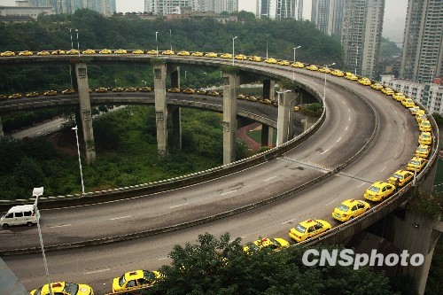 11月19日,重庆南坪融侨半岛立交桥上停满等待加气的出租车。近日,随着气温下降,重庆出租车再次出现加气难现象。当地相关部门积极协调增加供气量,并准备采取错峰加气、定点加气等措施。中新社发 郭晋嘉 摄