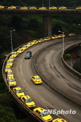 11月19日,出租车在重庆南坪融侨半岛立交桥上排着长队等待加气。近日,随着气温下降,重庆出租车再次出现加气难现象。当地相关部门积极协调增加供气量,并准备采取错峰加气、定点加气等措施。中新社发 郭晋嘉 摄