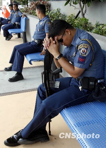 11月19日,在菲律宾首都马尼拉街头执勤的警察手握机枪小憩。中新社发 张宇 摄
