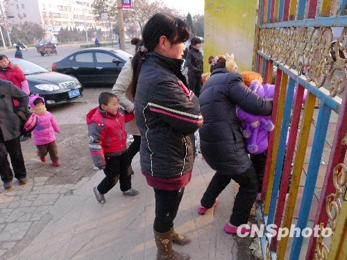家长通过被锁住的铁门栏杆间缝隙将孩子塞进幼儿园。中新社发 曹福川 摄