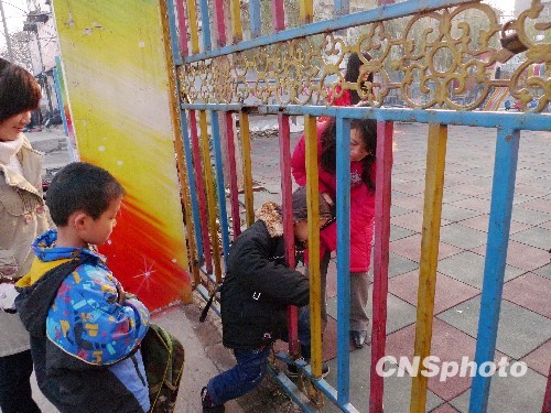 家长通过被锁住的铁门栏杆间缝隙将孩子塞进幼儿园。中新社发 曹福川 摄