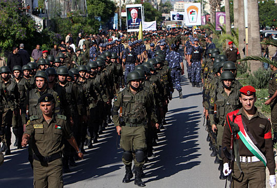 11月19日,巴勒斯坦安全部队在约旦河西岸的杰宁举行阅兵式庆祝巴勒斯坦独立21周年。