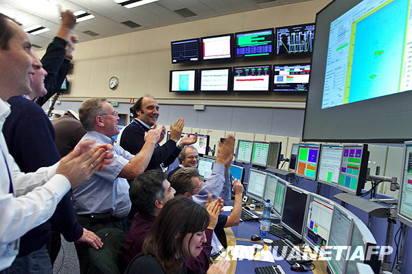 在瑞士日内瓦附近的大型强子对撞机控制中心,欧洲核子研究中心的科学家庆祝欧洲大型强子对撞机恢复运行。