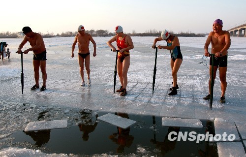 11月21日下午,在哈尔滨松花江公路大桥西侧,冬泳爱好者在江上采冰。当日松花江冰厚已达到20厘米,冬泳爱好者纷纷亲自下水采冰。