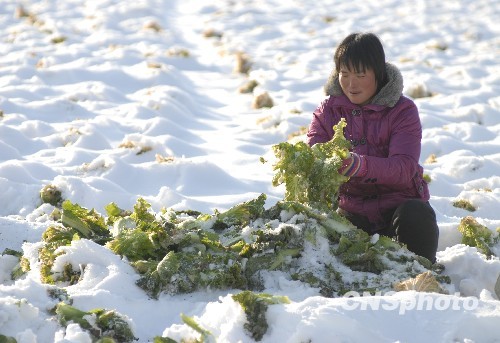 11月21日,山西省长治市长子县南陈乡东北陈村的菜农在雪地里抢收大白菜。由于近日的强降雪,使当地的秋冬菜田被积雪覆盖,蔬菜受冻,损失严重,目前,菜农正在积极抗灾自救,减少雪灾带来的损失。