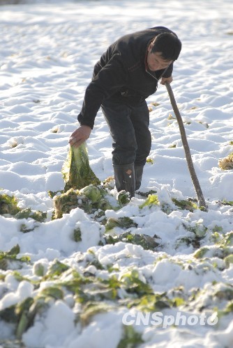 山西省长治市长子县南陈乡东北陈村的菜农在雪地里抢收大白菜。中新社发 姚林 摄