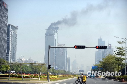 11月22日上午11点30分许,位于深圳市深南大道的在建的东海国际中心西座高楼燃火,浓烟从顶层冒出。