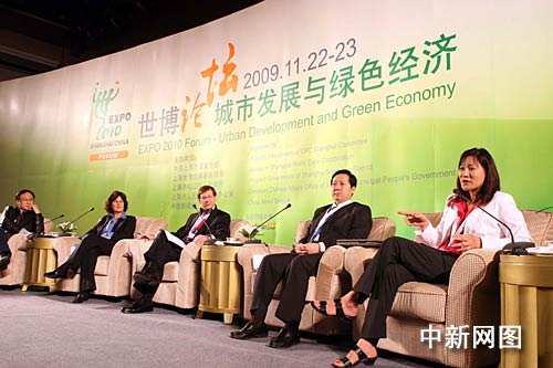 二十二日在上海松江开幕的世博论坛-城市发展与绿色经济上,中美市长热议“绿色经济”。图为论坛现场:右起美国库比蒂诺市副市长胡宜兰、中国信阳市市长郭瑞民(右二)等。