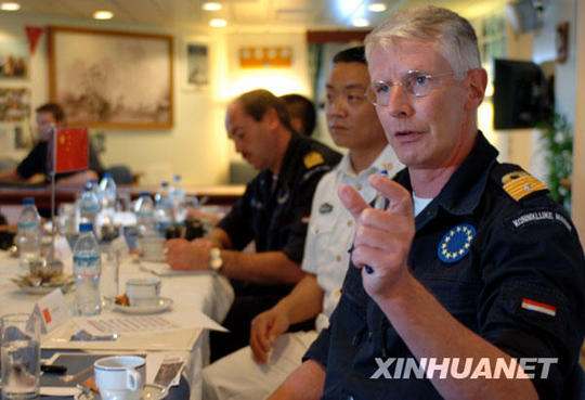 11月22日,在亚丁湾海域,欧盟465编队指挥官、荷兰海军彼得·宾特准将(前)向中国海军第三批护航编队指挥员王志国少将介绍其编队反海盗情况。