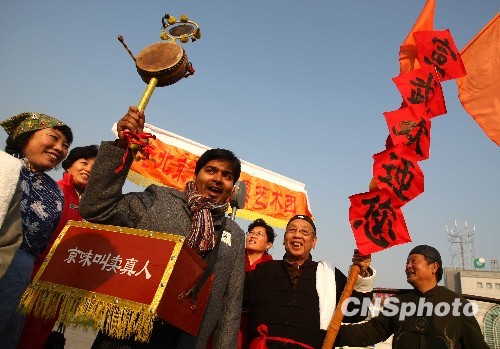 图为在当天的“文化之旅体验”活动中,来自印度Swapan先生在学老北京的叫卖。中新社发 富田 摄