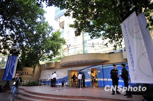 图为新闻中心入口已有警员把守。中新社发 谭达明 摄