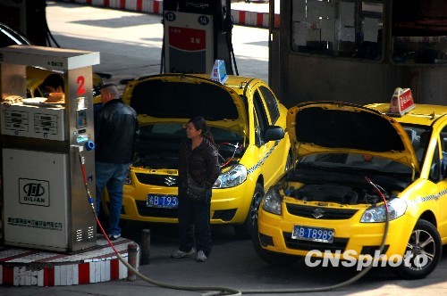 2009年11月22日,重庆市红石路加气站,出租车正在加气。自21日重庆市CNG(压缩天然气)涨价以及出租车收取2元CNG附加费以来,重庆市排队加气的局面大为改观,在重庆各大加气站均未再出现排队超过一公里加气的情况,一天中大多数时间加气情况较为顺畅。