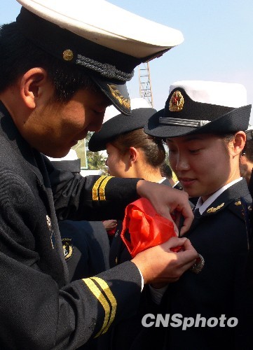 11月23日,南海舰队航空兵司令部举行退役老兵向军旗告别仪式。图为女兵中队干部给一名退伍老兵戴“光荣退伍”大红花。中新社发 邢利民 摄
