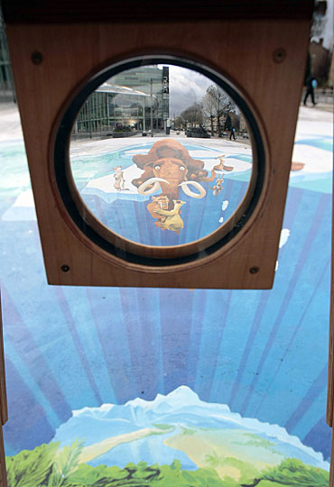 德国街头画家埃德加·穆勒在伦敦一家购物中心展示他以动画电影《冰河时代3》为主题创作的大型立体画。