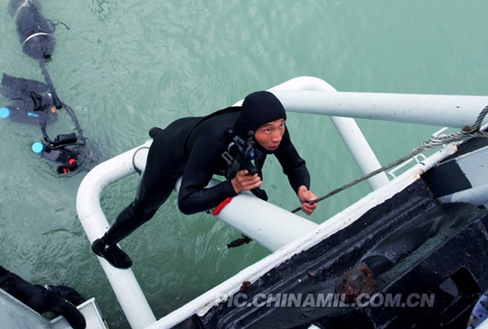 “空中,舰载直升机盘旋吸引敌人注意力,海面,蛙人隐秘下水,悄然抵近被劫船只……。”11月中旬,南海舰队某保障基地组织了一场实战条件下的反恐反劫持演练,通过立体封控、近距围歼“恐怖分子”、解救人质等不同环节的演练,有效提高了部队反恐应急处置能力。这是笔者在演练现场抓拍的一组蛙人突击的镜头。 (袁永东 郭帝帅 摄)