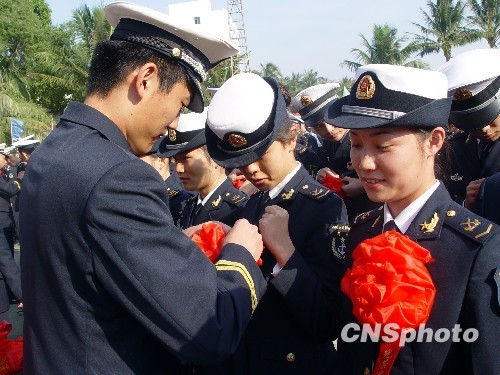 图为女兵中队干部在给一名退伍老兵戴“光荣退伍”大红花。中新社发 邢利民 摄