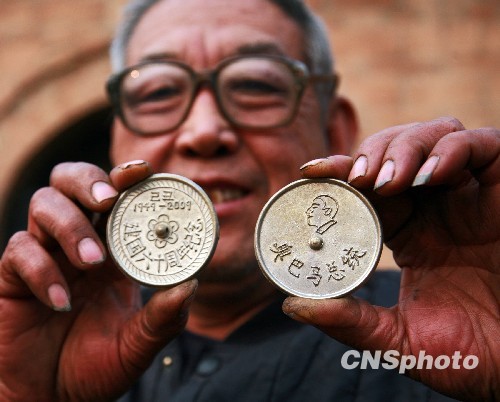 11月24日,在河北饶阳县张保村农民李兰捆展示自己磨制的“透光镜”。“透光镜”为西汉时期独特工艺制成的一种铜镜,以铜锡合金铸成,外观和普通铜镜无异,但镜面对着阳光向物体上反光时,可将镜背面的纹饰图案映射出来。为纪念美国总统奥巴马访华,李兰捆还特意打造了“奥巴马总统”字样及头像的铜镜。图为李大爷向记者展示“铜镜——透光镜”的背面。中新社发 翟羽佳 摄