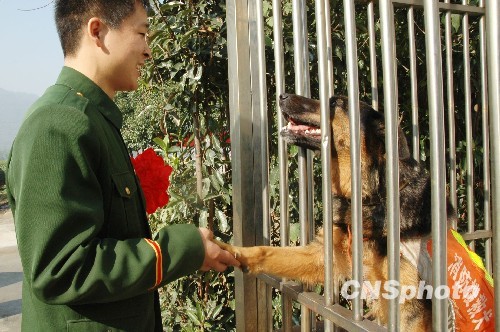 11月24日,江苏苏州消防支队训导员赵功明退役,并告别相处了7年搜救犬佳佳。据悉,他与佳佳曾一起参与了四川汶川地震救援、2008年大雪灾、南京桥梁坍塌和苏州煤气爆炸等多起事故的人员搜救工作。赵功明本人也荣立三等功两次,还被评为优秀共产党员。中新社发 苏民 摄