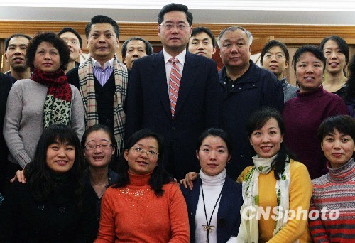 11月24日下午,北京二中的四十多名教师走进外交部新闻发布厅,旁听了一场外交部例行记者会,会后老师们争相与新闻发言人秦刚合影留念。中新社发 刘震 摄