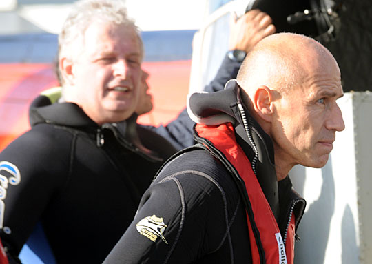 瑞士冒险家伊夫·罗西(右)和他的同伴离开发布会现场。