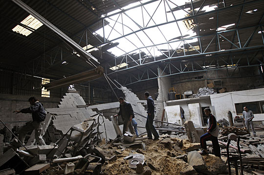 11月24日,几名巴勒斯坦人在加沙城里检查当天早些时候被以色列战斗机炸毁的建筑设施。