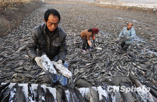 在山西省长治市郊区临漳村养鱼场,来自福建省的养鱼专业户程道城、程金兰夫妇忍痛清理被冻死的鲶鱼。中新社发 姚林 摄