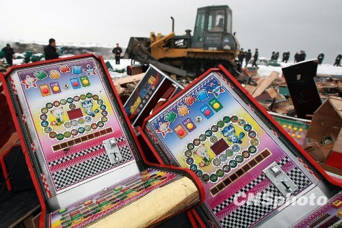 新疆乌鲁木齐警方日前在该市东山垃圾场集中销毁150台不同型号、不同功能的赌博游戏机及千余块电脑板等配件,案值近百万元人民币。据了解,乌鲁木齐警方于10月开展为期一个月的游艺娱乐场所专项整治行动,共检查游戏机场所293家,处理设置赌博机场所123家,收缴游戏机电脑板块1000余块、游戏机150台、显示屏16个、其他赌具5个人。