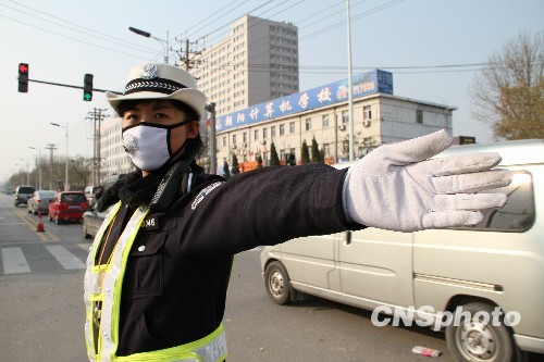 2009年11月24日,山东滨州,一交警戴口罩执勤。国内甲型H1N1流感疫情已进入流行高发期,山东滨州各行各业人士防范意识增强,纷纷戴口罩出行。