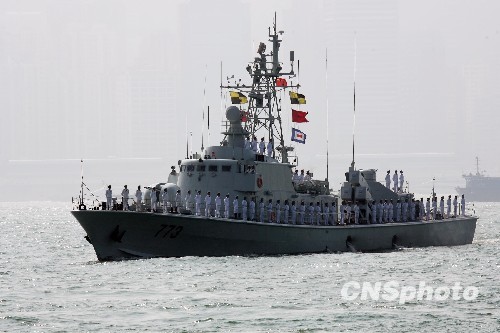 十一月二十五日十一时,香港驻军第十二次建制单位轮换海军部队舰艇准时扺达昂船洲基地,开始执行防务任务。 中新社发 郑祚声 摄