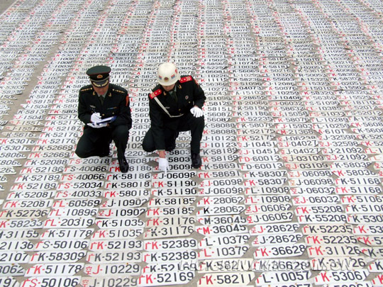 11月23日上午,南宁警备区警务办将这次严打整治行动中收缴的假军车号牌进行统一登记后销毁,并向媒体展示近年来在各次整治行动中查获的一批假号牌和假军车。