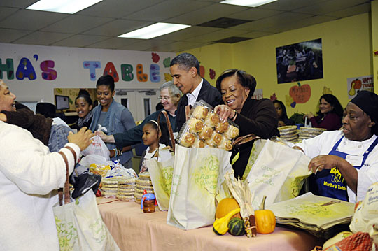 美国总统奥巴在慈善机构“马大的餐桌”前帮助分发食品。