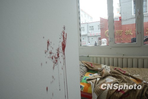 图为事发现场血迹斑斑。中新社发 靖阳 摄