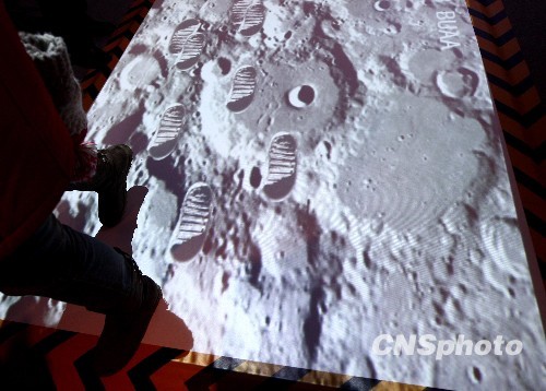 11月26日,北京国际文化创意产业博览会在北京开幕。本届文博会将展示广播电影电视、新闻出版与动漫游戏、体育产业、文化旅游、设计创意、文物及博物馆、画廊及艺术品等领域的文化品牌和创新产品;全国14个省份将整体展示和推出当地具有地方特色的文化产品和近年来倾力打造的文化创意产业园区成果。图为一家航天企业在展区中布置了“虚拟太空港”,观众可以在地面的模拟月球表面上留下自己的足迹。中新社发 杜洋 摄