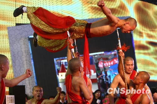 11月26日,北京国际文化创意产业博览会在北京开幕。本届文博会将展示广播电影电视、新闻出版与动漫游戏、体育产业、文化旅游、设计创意、文物及博物馆、画廊及艺术品等领域的文化品牌和创新产品;全国14个省份将整体展示和推出当地具有地方特色的文化产品和近年来倾力打造的文化创意产业园区成果。图为北京南锣鼓巷展区表演的少林功夫“硬气功”惊险刺激。中新社发 杜洋 摄