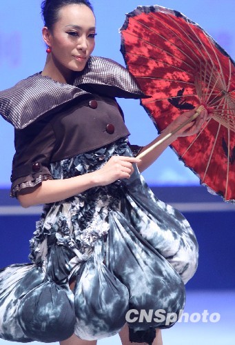 11月26日,由北京大红门国际服装节主办的首届“鑫福海杯”品牌服装概念设计大赛在北京正式启动, 本届大赛的设计主题为:中国民族文化,以北京大红门地区的自有服装品牌作为参赛青年设计师进行作品设计的基础,每位参赛设计师在5套现有服装的基础之上进行二次设计,中国服装设计师协会陈列设计专业委员会及专家评审团为此次大赛的评审机构。这是中国第一个开创性地对现有服装进行再设计的大赛。图为模特展示参赛设计师获奖作品。中新社发 钱兴强 摄