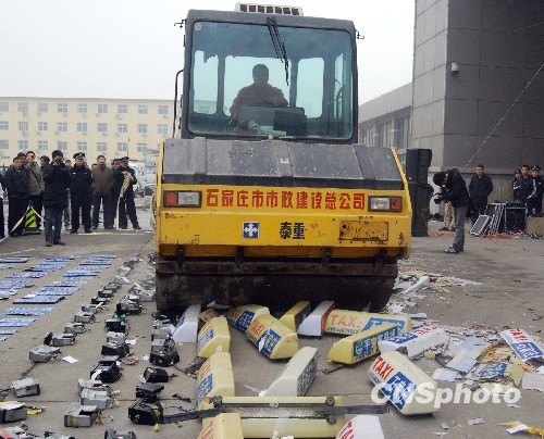 11月27日,河北石家庄市公安局公交分局在长途客运总站站前广场,销毁了用于非法经营“黑出租”的顶灯、计价器、车牌照等相关标志200余件。