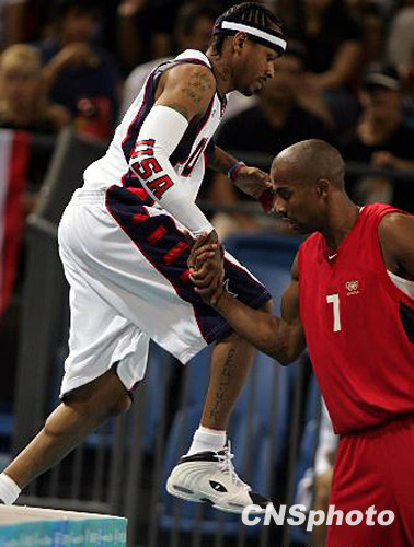 当地时间8月23日下午,美国“梦六队”在雅典奥运会小组赛最后一场比赛中以89比53战胜本组最弱的球队安哥拉队。资料图为球星艾佛森冲到界外拼抢救球。中新社发 任晨鸣 摄