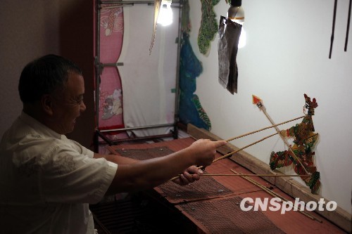 11月27日,大陆“国家级非物质文化遗产项目代表性传承人”范正安在首度来台的“根与魂——中华非物质文化遗产大展”上耍起了皮影独门绝技“十不闲”。“十不闲”即一个人演出一台戏的功夫,摆弄皮影人儿、唱词念曲、鼓乐伴奏等全由一人包揽,五官、四肢、头脑都不能闲着,范正安的表演让观众领略到“天下一绝”的独特风范。中新社发 李佳佳 摄