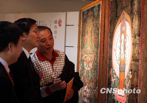 11月27日,来自青海热贡地区的唐卡绘画引起台湾文化界人士的关注,热贡艺术传承人娘本(右一)在中华非物质文化遗产大展现场回答观者提问。当日,“根与魂——中华非物质文化遗产大展”首度赴台盛大展出,现场不仅进行二百多件中华文化瑰宝的展示,还邀请十余位非物质文化遗产的传承人亲临现场示范,以互动的方式让台湾同胞能亲身体验精彩的中华文化。中新社发 李佳佳 摄