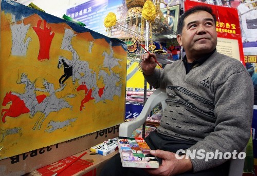 11月27日,第四届中国新疆冰雪旅游节暨冬季旅游产业博览会在新疆国际博览中心隆重开幕,来自麦盖提县的农民画家艾尔肯·司依提在展会现场展示维吾尔农民画技艺。本届冬博会以“魅力新疆 冰雪风情”为主题,共有展位570个,包括来自美国、法国、加拿大等国家和地区的73个境外展位。中新社发 刘新 摄