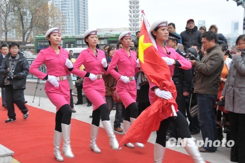 11月27日,被誉为“徒步方队最美女队员”国庆60周年阅兵式女民兵方队领队张晓菲携部分队员亮相潍坊某百货大楼店庆活动中,使潍坊市民得以近距离目睹女民兵的风采。中新社发 贾春毅 摄