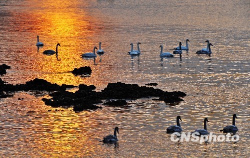 2009年11月以来,数量庞大的天鹅不远万里从西伯利亚、内蒙古等地,陆续飞临山东威海天鹅湖越冬,蔚为壮观。中新社发 滨海之光 摄